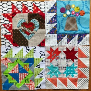 And that’s another block done and ready to join the others! I hope you’ve learnt something new. We all have our favourite techniques and I know fiddly work isn’t for every one. You may want to skip making the bias tape loops and just applique ribbon or use embroidery to create the loops. And instead of those wonky juggling balls you can fussy cut some fun fabric circles…